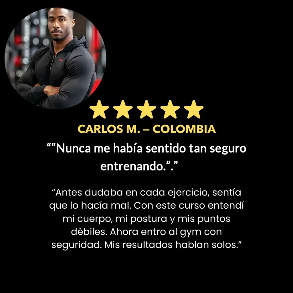 A través de clases en video, aprenderás las bases biomecánicas y prácticas de cada ejercicio, cómo corregir tu postura, activar el músculo objetivo y controlar cada fase del movimiento para obtener el máximo rendimiento.